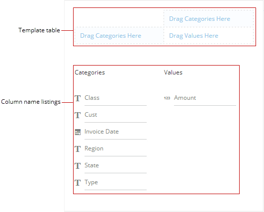 In most circumstances, you will move values columns into the Drag Values Here region of the template table and category columns into the Drag Categories Here regions. However, you are not obligated to do so. If you want, you can move values columns into the category regions and vice versa.