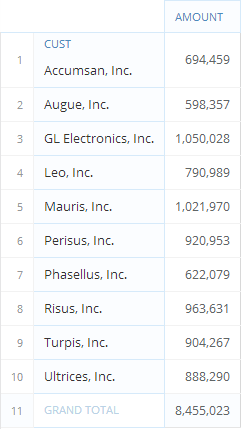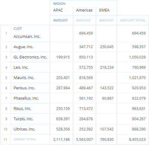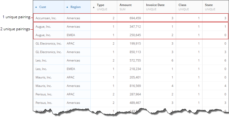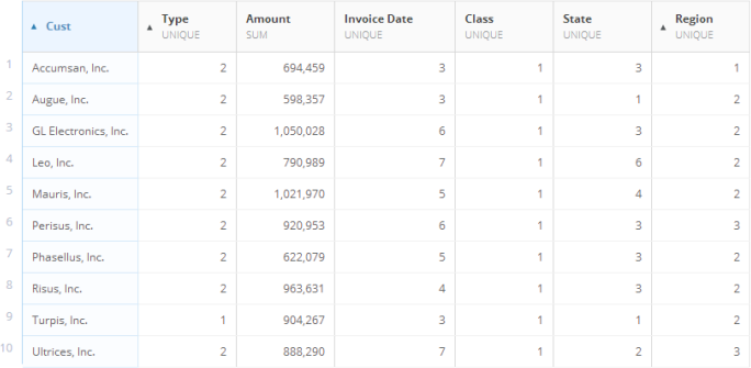 In Pivot View, you can apply multiple sorts to your table so long as you sort only series and date columns. For example, you could have a descending sort in your date column (so that the most recent date would appear at the top) and an ascending (alphabetical) sort in your series column. When you sort by a values column, other columns are sorted accordingly to match the order of the values. In the following example, the user has applied an ascending sort to the “Amount” column. The “Region” and “Cust” columns are both sorted individually to match the sorting of the values within them. For each “Region”-“Cust” pairing, an individual total is given, and subtotals are provided for both regions.