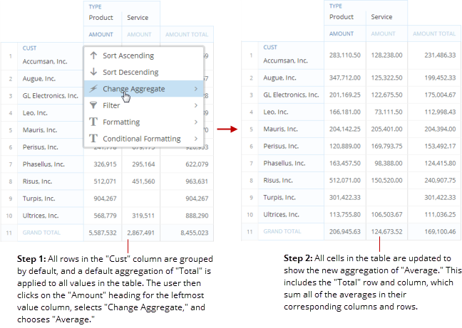 You can also change how your column totals are aggregated in Column View. Each column in this view includes a “TOTAL” cell at the bottom. By default, totals for numeric columns are calculated by summing all of the values in the columns, and totals for string and date/date-time values are determined by counting all of the unique values in the columns. You can click the aggregation indicator in a total cell to pop up a list of alternate aggregation types. If you change the total aggregation type for a column that has itself been aggregated (by applying a “Group” or “Date Grain” to the table), the aggregation type for the column is also changed. Otherwise, changing the aggregation type affects only the total for the column. In the following example, the user has grouped the “Cust” column and applied a monthly date grain to the “Invoice Date” column. By default, all of the values in the “Amount” column are summed to yield a total value of “1,620,327.”