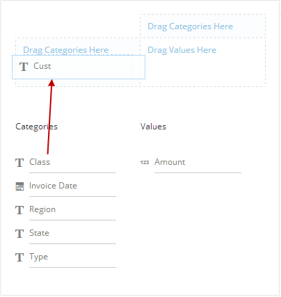 The following example shows how a user might build a typical pivot table showing profits gained from customers. The user wants to show customer names in the rows, so he drags the “Cust” column name from the Categories listing into the left-side Drag Categories Here region of the template table, as shown below:
