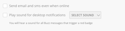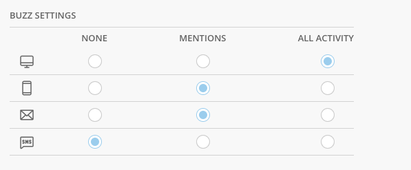 You can configure your Buzz notification settings using the radio buttons in the Buzz Settings section in Notifications.