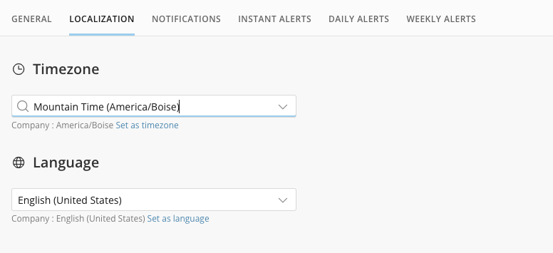 You can configure your localization settings from the Localization tab. Localization settings include timezone and language.