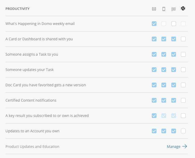 The Notifications tab allows you to enable/disable desktop, mobile, email, and SMS message notifications. These notifications include events like when a card or dashboard is shared with you, when an approval request is waiting on you, or when a card you have favorited is updated.
