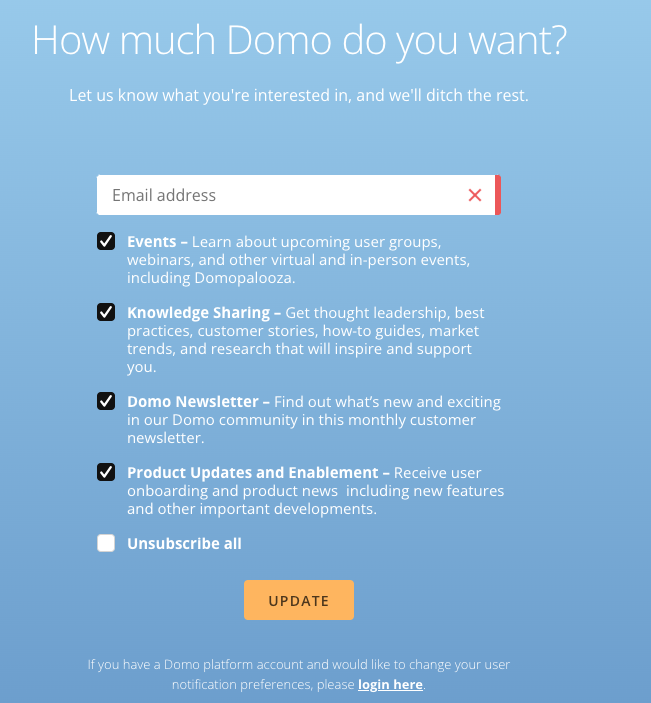 - Events — These emails inform you about upcoming user groups, webinars, and other virtual and in-person events, including Domopalooza.