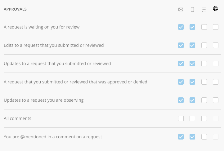 - When a request you have submitted or reviewed has been approved or denied (email, mobile, SMS, Slack)