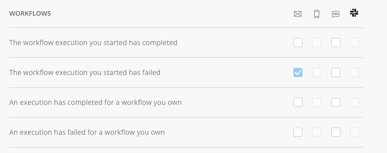 You can manage the notifications you receive about your Workflows under the Workflows section in the Notifications tab.