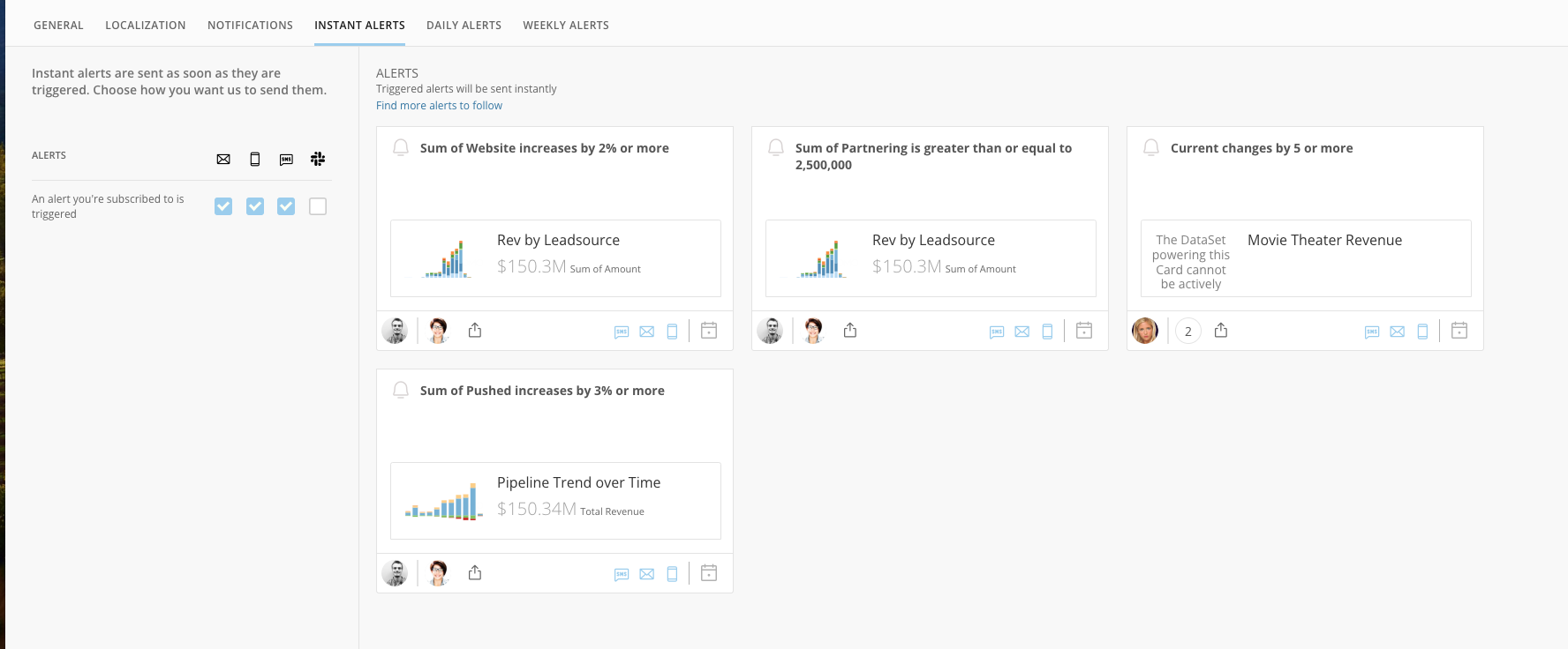 On your Settings page, there are three tabs for alerts: Instant Alerts, Daily Alerts, and Weekly Alerts.- When instant alerts are triggered, notifications are instantly sent to email, SMS, Domo Mobile, or Slack.