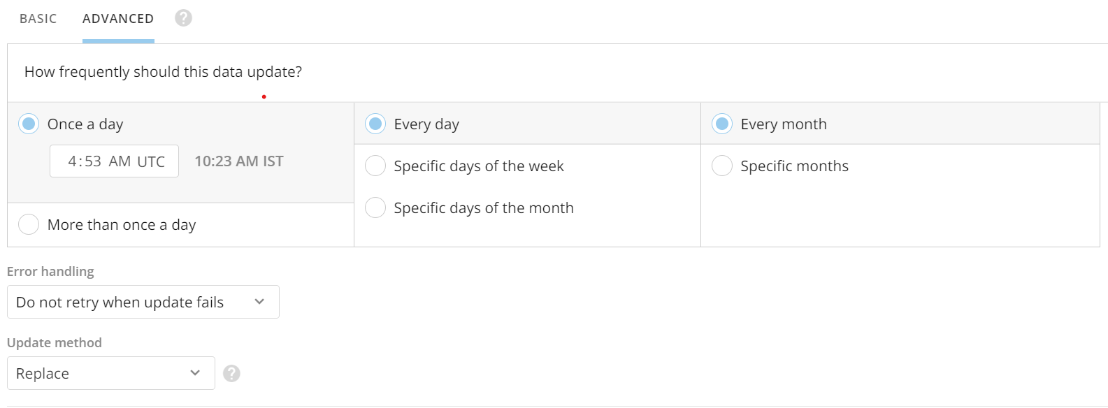 In the Scheduling settings category, you can specify the update schedule, retry settings, and update method you want for this DataSet. You can use either basic or advanced scheduling for connectors.Basic scheduling