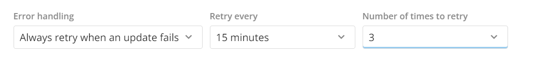 Do not retry when update fails | Domo sends a notification if the update attempt is unsuccessful, and no retries are made. |