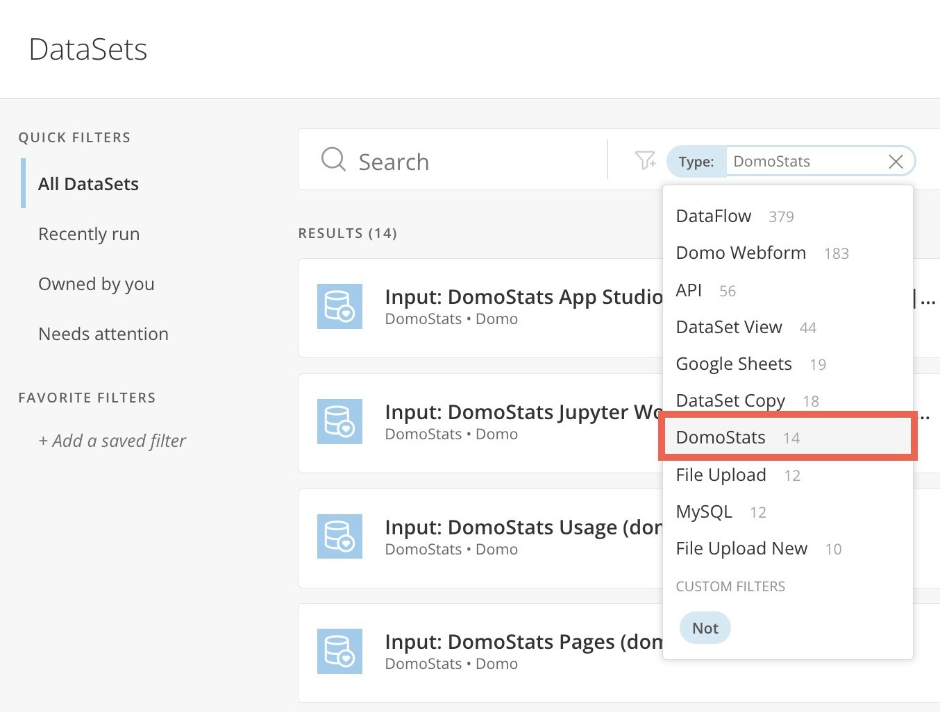 After downloading the app, navigate to DataSets. Then use the Add Filter option to select a Type > DomoStats filter.