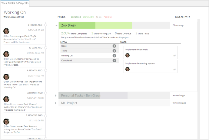 icon. This pane also includes a live “work log” containing updates for all of this user’s projects. For example, when a task is created in a project, a notification appears in the work log.