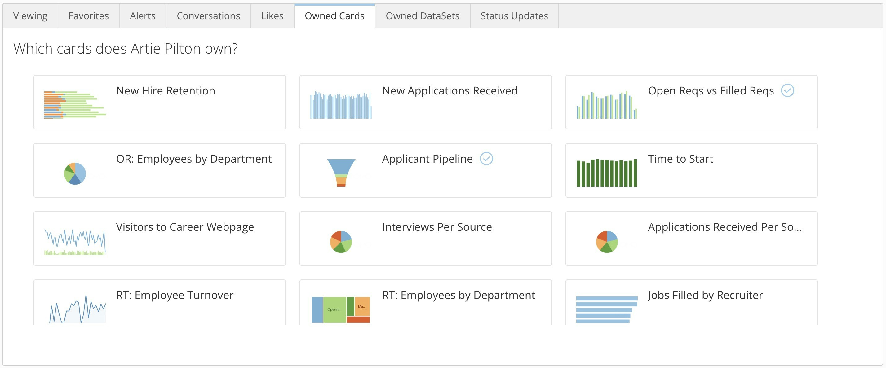 In the Likes tab, you can see all of a user’s “liked” Buzz conversations (that is, initial posts in Buzz), Buzz comments, photos, status updates, and tasks. Each “liked” item appears in its own card. For any item, you can hover over the thumbs-up icon to see which users have liked the item or click it to like it yourself. Learn more about tasks and status updates.Owned Cards