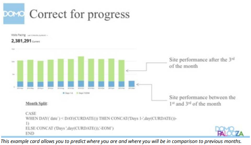 Comparing current data to historical data is another effective way to track progress. Historical data provides the context that many executives and managers need to determine how their strategies and activities are making an impact on the growth of the company. This example card allows you to predict where you are and where you will be in comparison to previous months.