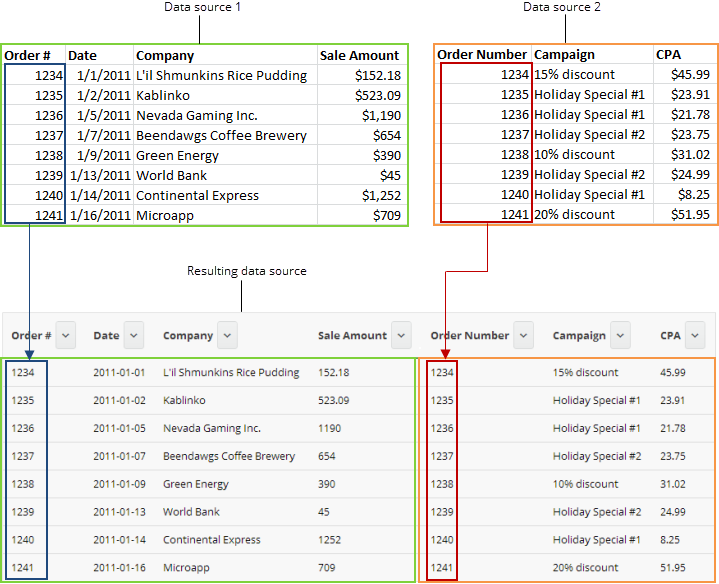 In this method, you select two or more DataSets, each of which contains at least one column that matches a column or data type in one of the others. You then combine all of the DataSets into a single DataSet by matching similar columns. This method is equivalent to using a JOIN in SQL. In the following example, a user uploads and combines two DataSets using this method. The user matches the “Order #” and “Order Number” columns, and the second DataSet appears to the right of the first.