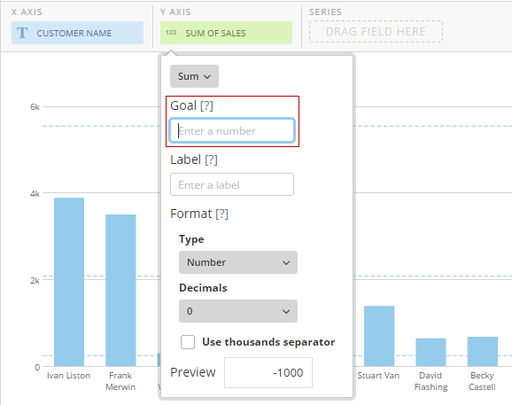 The simplest way to configure a goal marker is by entering a target value in the Goal field. This field is found in the dialog of additional options that appears when you click a column name in the fields region above the chart preview. This field is available only for value data.