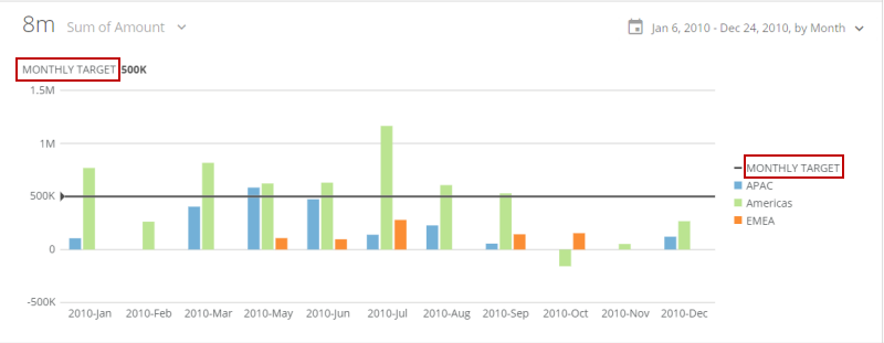 Text | Lets you specify text to replace the default word “GOAL” that normally appears above the top left corner of the graph when a scale marker has been set. If the graph contains a legend, an item for the scale marker is added to the legend with this text (unless you hide it by checking the Scale Marker > Hide in Legend box). The example shows a chart in which “MONTHLY TARGET” has been entered as the custom text. | |