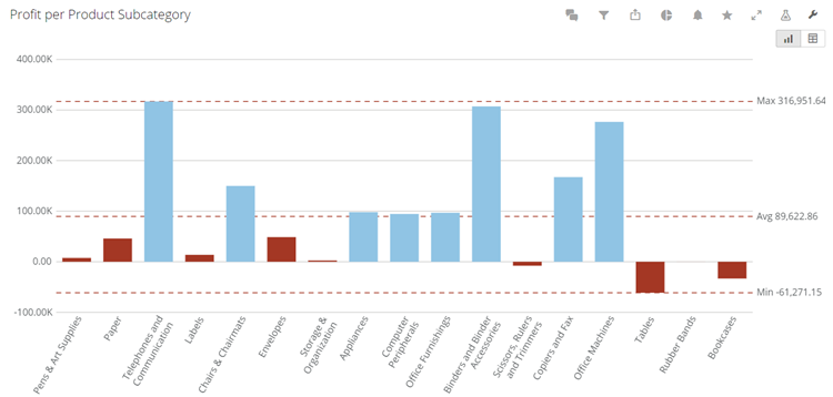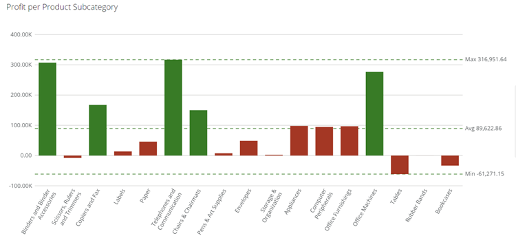 You can set rules on a chart so that specific colors are used when values meet certain conditions. This is shown in the “Profit per Product Subcategory” example above, in which the bars that fall below a certain value appear red, while all other users use the default blue. You could go a step further and set a second rule on the same column stating that all values above the specified value appear green. Thus “poor” values appear as red and “good” values appear as green, and the default blue is not used at all. This has been shown in the following example, in which all values equal than or greater to 100,000 appear green and all values less than 100,000 appear red: