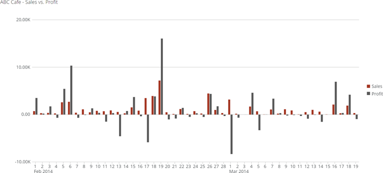 When you create a chart for displaying data for your users, it is often helpful to highlight exceptions and use consistent colors. The Color Rules tool in Analyzer helps you do both. Using Color Rules, you can apply colors to specific columns in a chart or set conditions in which certain colors are shown. For example, the owner of the ABC Cafe wants to replace the default Domo color scheme with a custom scheme more fitting for his business. He does this by going into the Color Rules dialog and setting the “Sales” series column to red and the “Profit” series column to black.