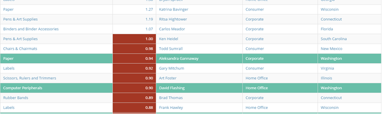 In tables, additional formatting options are available, including shading and styling options, as well as the ability to specify whether the rules apply only to the specific cell or to the whole row. In the event that a table row is affected by more than one rule, precedence is given to the newest rules. For example, a user working in the “Western” region may apply a rule to a table that changes the color of all of the states in his region to turquoise. If he then adds a second rule stating that cells in the “Profit” column with negative values appear red, this rule is applied to all cells in that column meeting that condition, whether or not they are in the “Western” region. This is shown in the following example, for the “Paper” and “Computer Peripherals” rows.