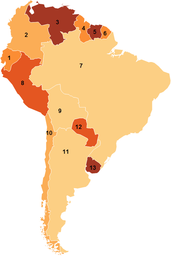 You may reference nations in South America using their full names or their two-digit ISO 3166-2 codes. You can use the following map and numbered list to determine the code for each nation.