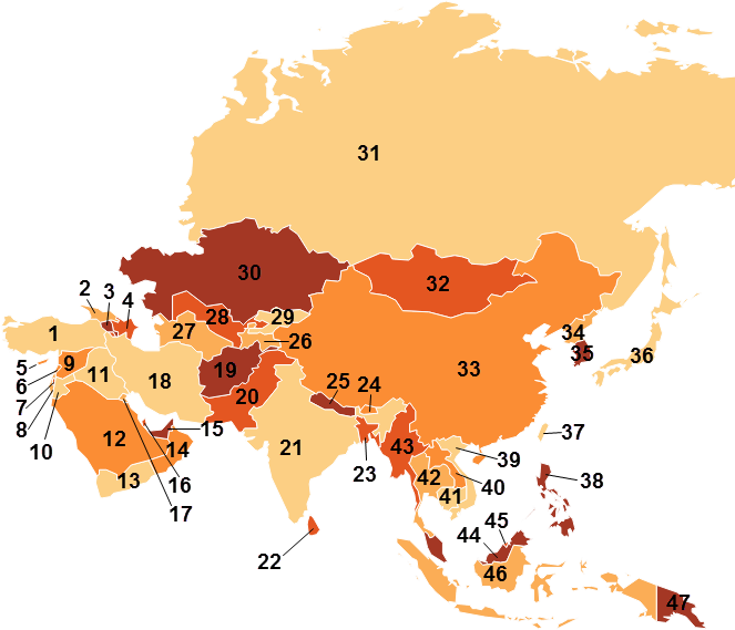 You may reference Asian nations using their full names or their two-letter ISO-3166 codes.