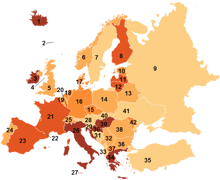 You may reference European nations using their full names or their two-digit ISO 3166-2 codes. You can use the following map and numbered list to determine the code for each nation.