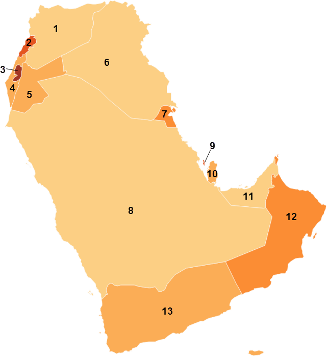 You may reference nations in the Middle East region using their full names or their two-digit ISO 3166-2 codes. You can use the following map and numbered list to determine the code for each nation.