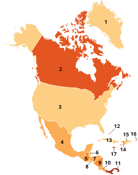 You may reference countries in North America using their names or their two-letter ISO-3166 codes. You can use the following map and numbered list to determine the code for each country:
