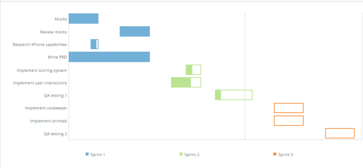 Gantt charts are used to illustrate project schedules. Each task in a project is represented as a horizontal bar with a start date and end date. Tasks are represented along the vertical axis, and dates are represented along the horizontal axis. You can break tasks down by project, in which case each project is shown in a different color and appears as a legend item. However, projects are optional in Gantt charts. There are three types of Gantt charts in Domo—regular Gantt charts, Gantt Percent Complete charts, and Dependency Gantt charts. The difference between these is that Gantt Percent Complete charts show the completion percentage for each task bar. For any series, this percentage is represented by the amount of colored fill in the bar. The fill amount compared to the total length of the bar gives the viewer an idea of the percentage complete for that task. For example, if the fill for a series filled almost the entire bar, a viewer could deduce that the task was nearly complete. The Dependency Gantt chart handles changes in dates for you and gives many new display options to communicate project timelines.Powering Gantt charts