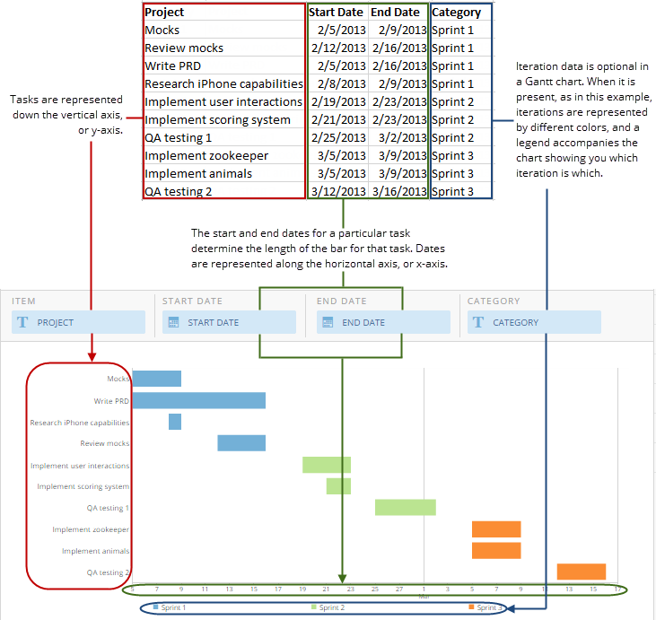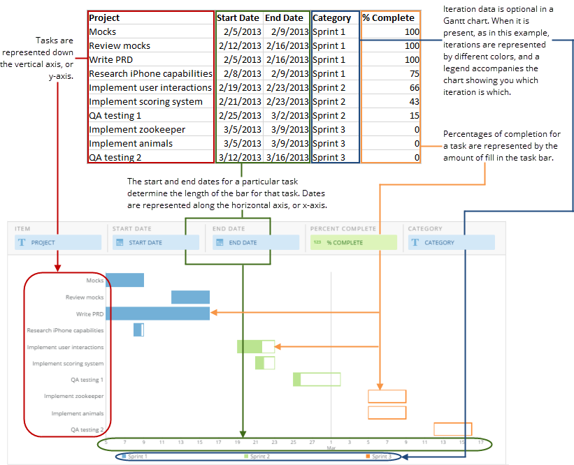 Standard Gantt charts require three columns or rows of data from your DataSet—one for tasks, one with start dates for each task, and one for end dates for each task. Percent Complete Gantt charts require all of these as well as a fourth column containing percent complete values for each task. If you want, you can also add an additional column containing project category data to a Gantt chart. Adding project category data to a Gantt chart causes the bars for each category to appear in different colors, indicating multiple projects. Also, a legend is added to the chart showing you which project category is which. For information about value, category, and series data, see Understanding Chart Data. In the Analyzer, you choose the columns containing the data for your Gantt chart. For more information about choosing data columns, see Applying DataSet Columns to Your Chart. For more information about formatting charts in the Analyzer, see Visualization Card Building Part 2: The Analyzer. The following graphic shows how the data from a typical column-based spreadsheet is converted into a standard Gantt chart: