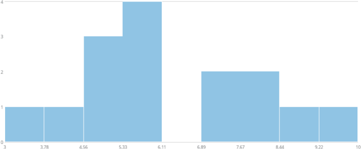 Histograms require only two data columns or rows from your DataSet. One of the columns contains category names, and the other contains the associated values. Note that the category names themselves do not appear in the chart, but are counted and represented numerically. Also, values do not appear as is, but are converted into ranges in your chart. An optimal number of ranges (and hence, bins) is determined automatically, but you can change the default number of bins in Chart Properties, as seen in the section below on Customizing histograms.Note: Histograms have a limit of 25,000 rows of data.