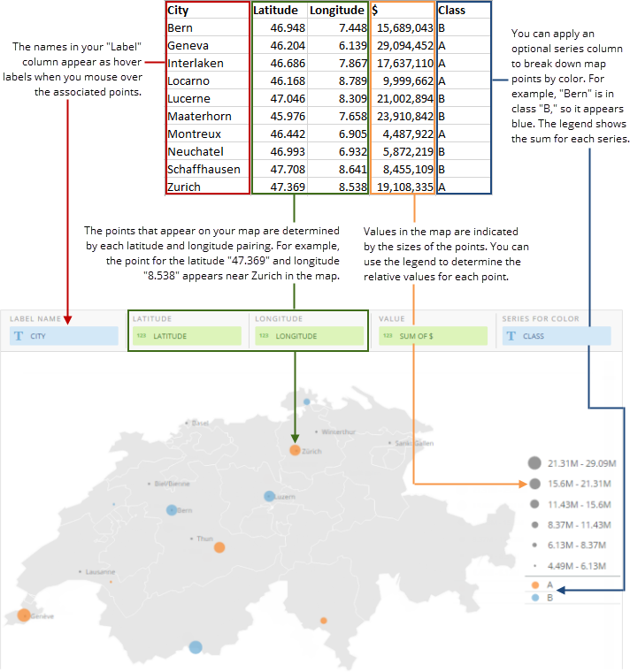 Latitude-longitude maps require four data columns or rows from your DataSet, though you can add an optional fifth column for series data if you want. One column or row contains the latitudes of the points you want to plot, one contains the longitudes, one contains the values that correspond with each latitude-longitude pairing, and one contains text for the hover label that appears for each point. Maps also include permanent data labels for specific cities. These are not determined by your DataSet—they are included automatically based on the region. For this reason, it is possible your map may include points that do not have data labels. However, all points have hover text. Values are represented in your map by varying point sizes, each size of which corresponds to a specific range. Ranges are determined automatically based on the distribution of values in your DataSet and are represented by a legend, which is automatically included beside the map. If you want, you can add an optional fifth column that contains series data, which is represented in the map by varying colors of map points. For example, if the cities in your DataSet were broken down into two different classes, “A” and “B,” the points within class “A” would appear orange by default, and the points within class “B” would appear blue. The sums for each series are shown in the map legend. If a user clicks on a point in a latitude-longitude map with series data, the drill table that appears shows all items for that series in the map. For more information about drilling into a chart, see Drilling into Data. For information about value, category, and series data, see Understanding Chart Data. Latitudes and longitudes are recognizable by Domo in any of a number of different formats. For a list of accepted formats, see Formats for latitudes and longitudes.Powering latitude-longitude maps
