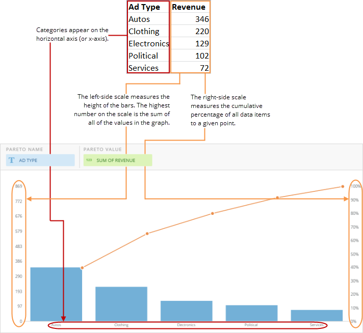 Pareto charts are single-series bar charts with categories ordered according to the size of their data items (largest to smallest). A line above the bars shows the cumulative value of all of the data items to that point. A Pareto chart has two scales—one on the left that shows the actual data values, and one on the right that measures percentages of the total value of the data series.Powering Pareto charts