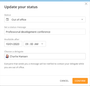 Update your status on web or mobile to Available, Busy, Away, or Out of the office. When someone sends you a 1:1 message or @mentions you in a conversation and your status is set to something other than Available, they will see a warning message that states you are unavailable. You can add custom messaging to your status message when you are unavailable as well as assign a delegate when you are Out of office. An icon on your avatar indicates your current status. When your status is set to Available, a colored dot will show on your avatar, Green indicates you are Available and have been interacting with Domo. Yellow indicates that you Available, but have not been active within Domo recently. Gray means you are logged out of Domo. These colors are automatically updated by the system based on your activity inside of Domo.