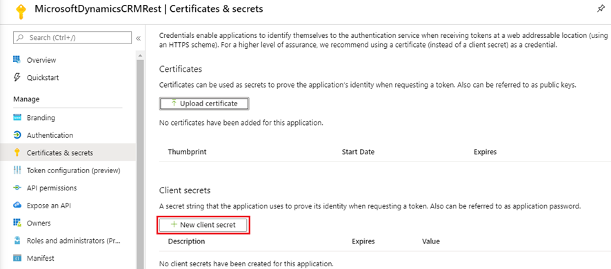 - Click on Certificates and secrets. Certificates can be used as secrets to prove the application’s identity when requesting a token. Also, can be referred to as public keys. Click Upload certificate to upload a new certificate for your App.