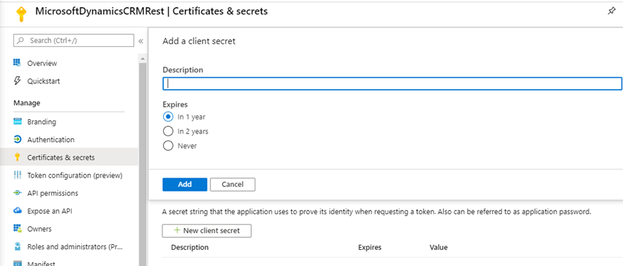- Specify the client secret description and the expiry period for your client secret, and click Add.