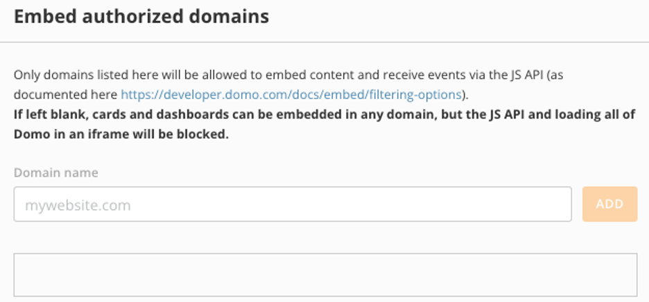 You can use Embed Authorized Domains to place domains on an allowlist, which helps keep your data secure and only displayed in the places you want. Domains on the allowlist can have content embedded and receive events via the JS API. If content is placed in an unauthorized domain, it does not load. To learn more about this, see the Domo developer docs