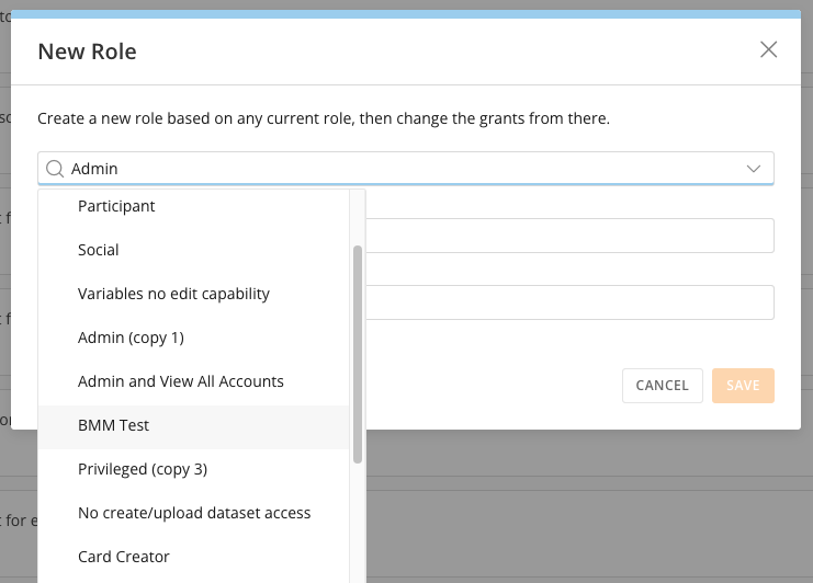 In the modal, use the dropdown to choose an existing role to copy. This can be a system role or another custom role.