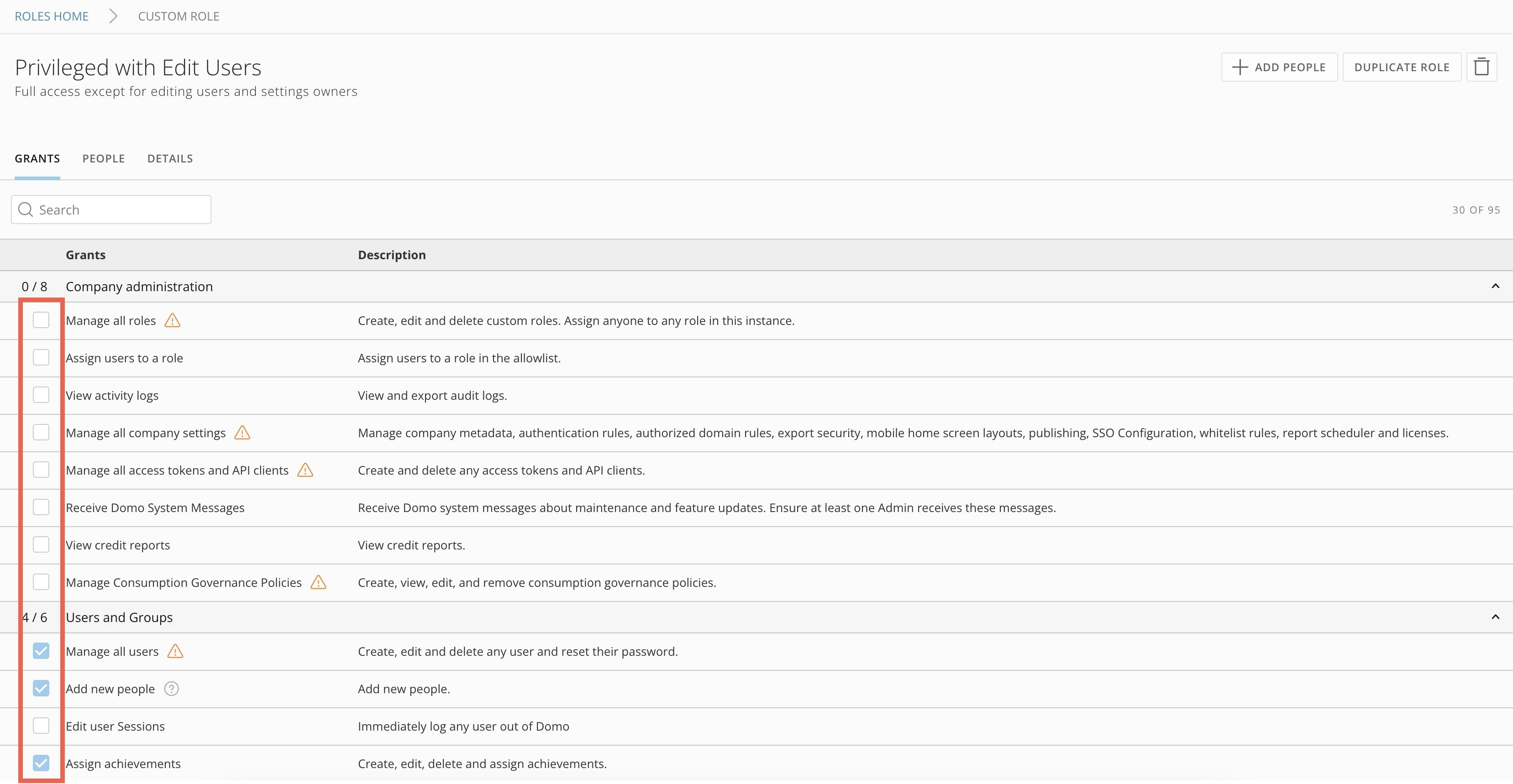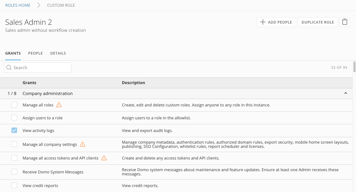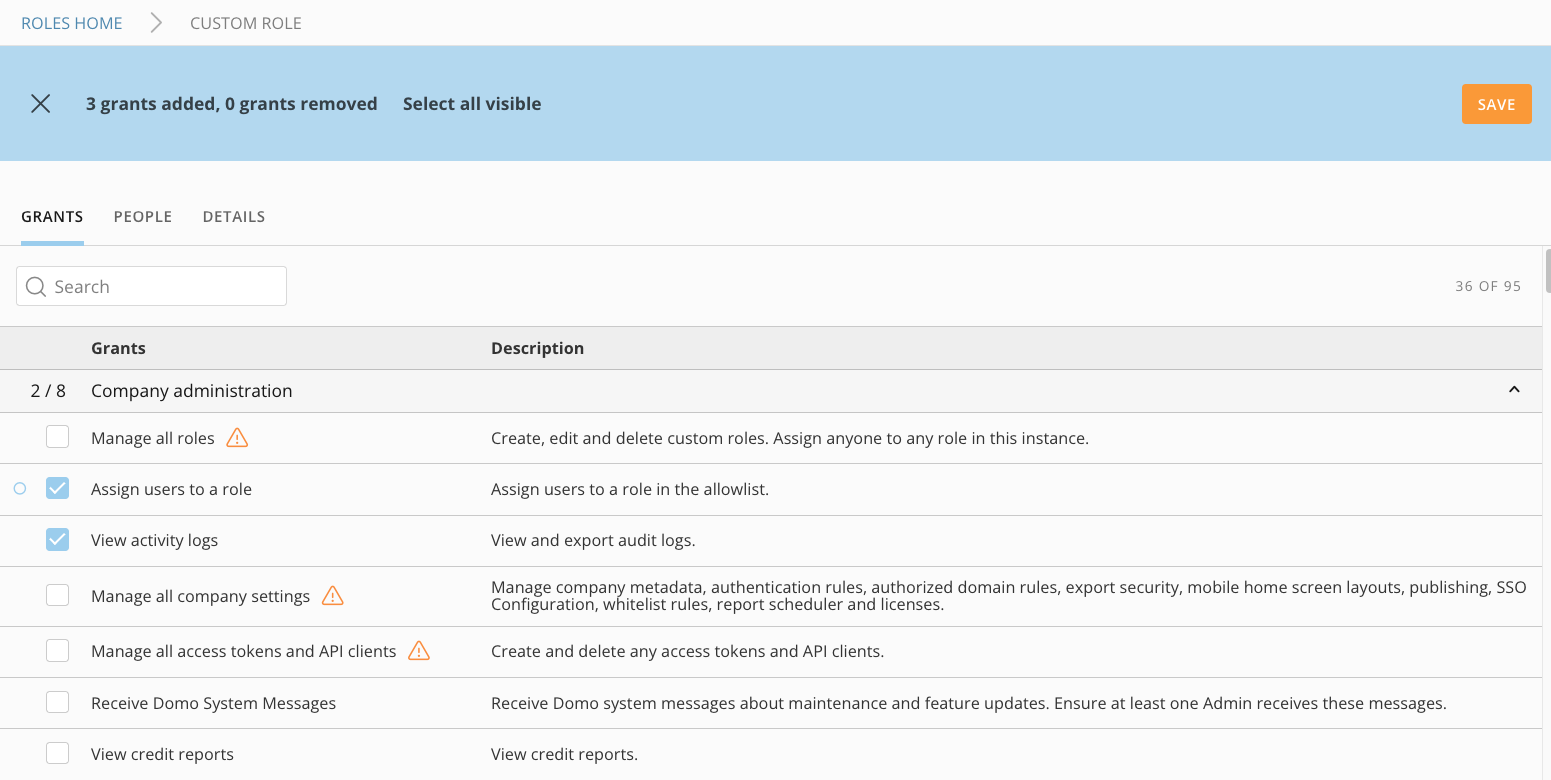 ) provide access to highly sensitive capabilities, such as configuring the security settings of the Domo instance or elevating user roles. These grants are only intended for admin-level users and should be assigned with care.