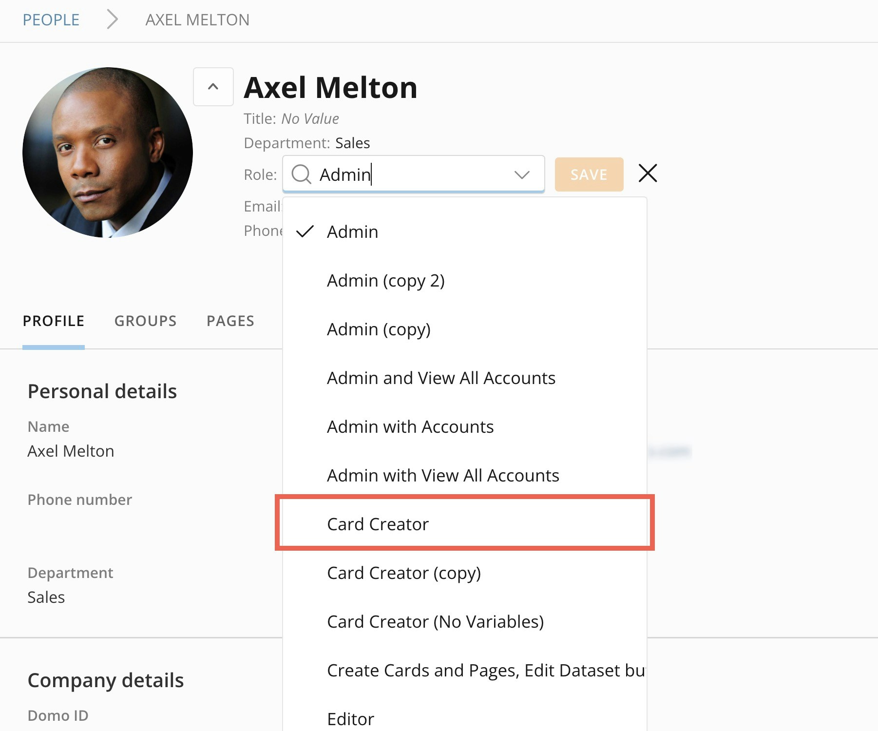 In Domo, new roles are created by using existing roles as templates. Since system roles cannot be modified, all new roles are custom roles. Admins can use any system role or existing custom role as a template, duplicate it, add or remove grants, and save it as a new role. Follow the steps below to create a new custom role:- Access the role management interface, as described above.