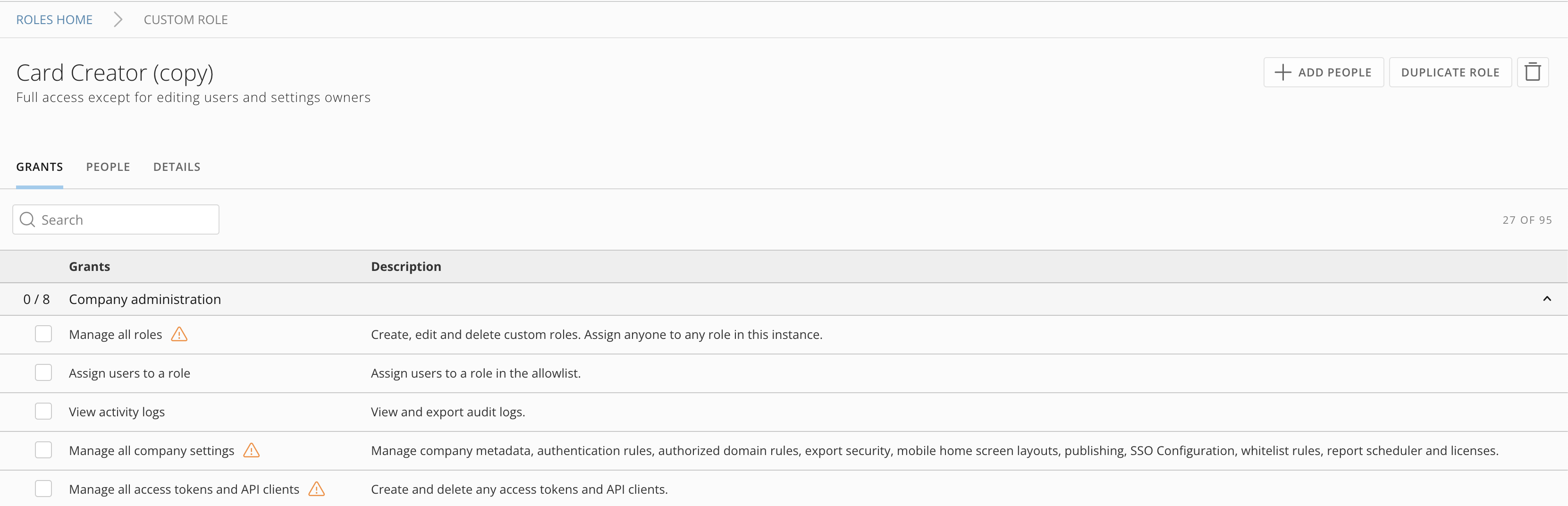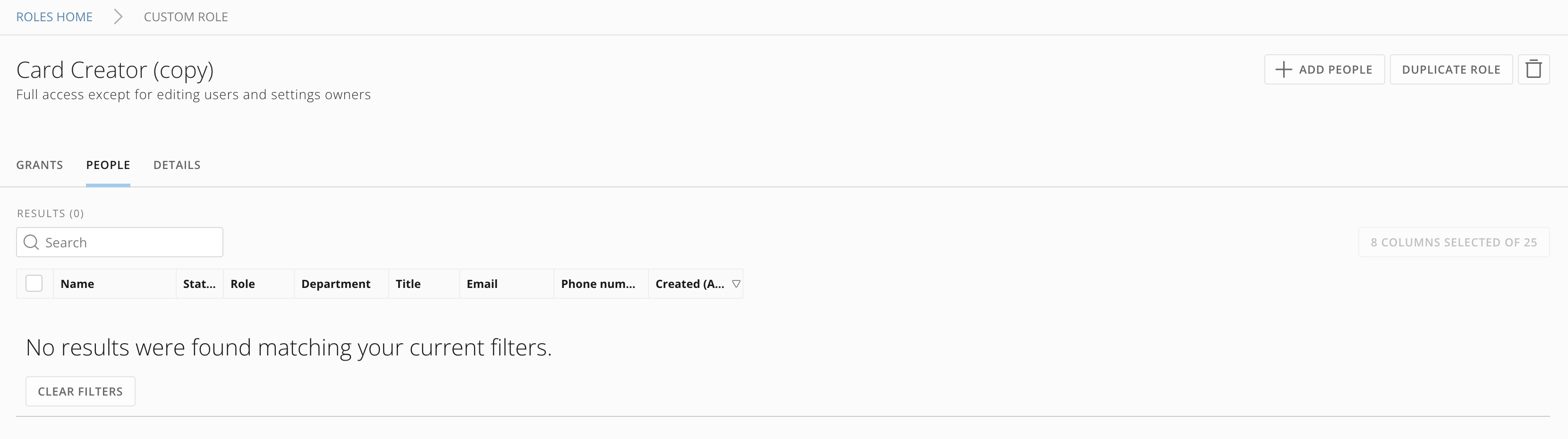 Sometimes, an existing role includes nearly all of the grant an admin wants to provide a user, but requires minor revision. Admins can duplicate any existing role, add/remove grants, and save the new role so it can be assigned. This is the same process as creating a new role. Learn how to create a new role above.Delete a Custom Role
