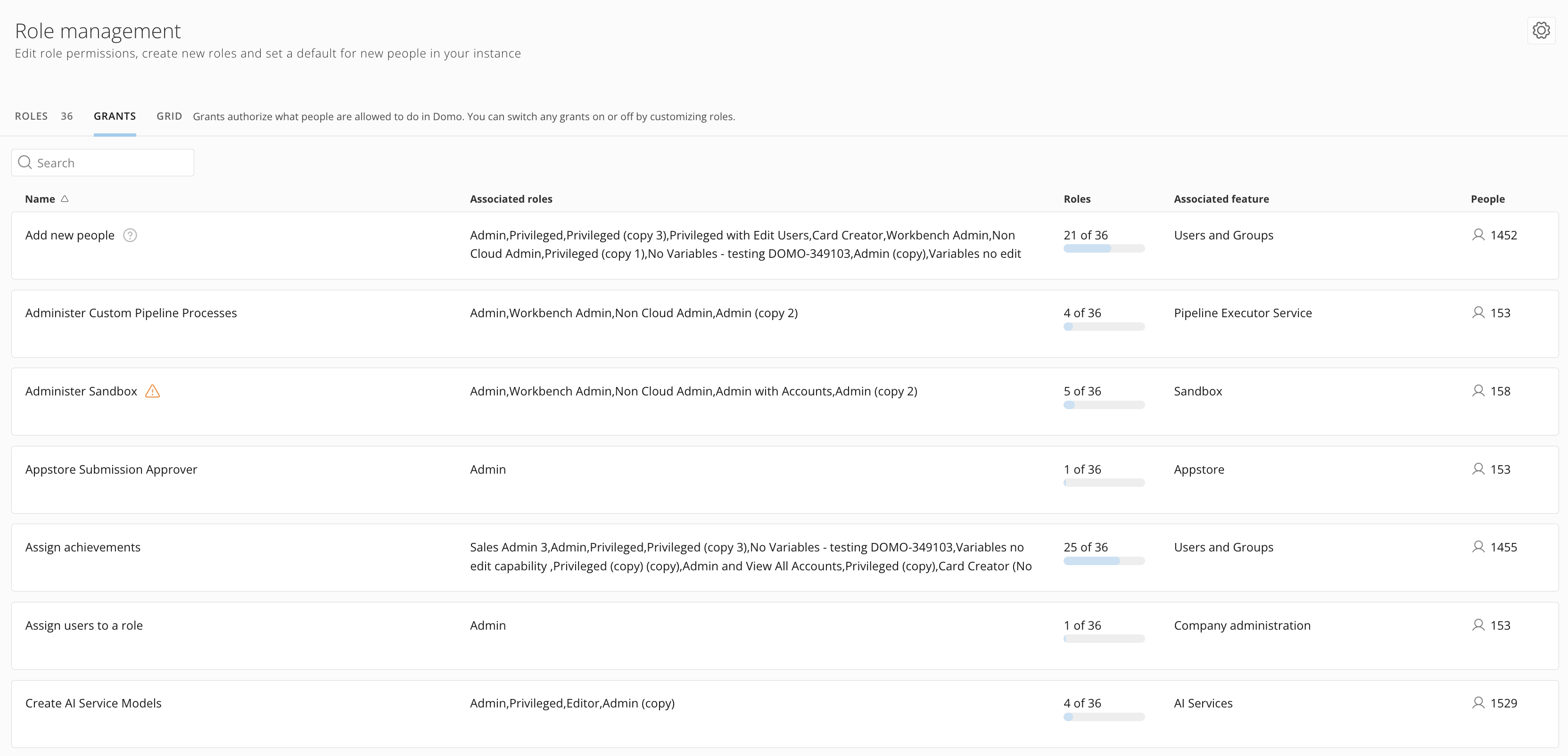 Admins can view all instance grants, including what roles they are associated with, the feature they relate to, and the number of people who hold the grant as part of their assigned role. Access this information by going to Admin > Governance > Roles. Then go to the Grants tab.
