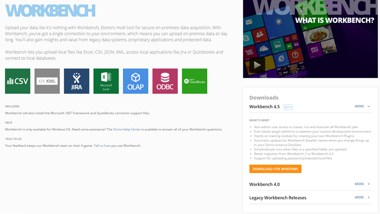The Workbench download page has been updated to provide a more visually pleasing user experience, more thorough information about Workbench, and “What’s New” notes and download buttons for all of the most recent releases. In addition, it has been moved out of the Admin Settings and into a more fitting location in the Data Center. To access the new Workbench download page, select