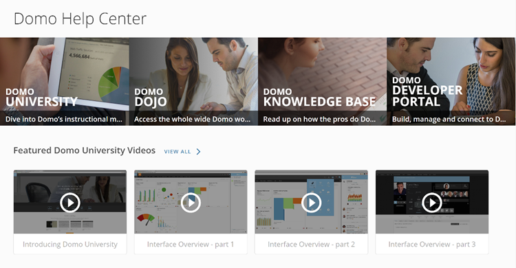 When you now click the Help Center link in the main menu, a page opens within Domo from which you can navigate to Domo University, the Domo Dojo, the Knowledge Base, or Domo’s Developer Portal. The page also contains several featured videos, which you can play right in this page instead of first having to navigate to the video library in Domo University, as well as the help guides found within Domo. Note that to access Domo’s user documentation, you now click Domo Knowledge Base in the new Help Center page. Previously, clicking Help Center would open the user documentation directly.