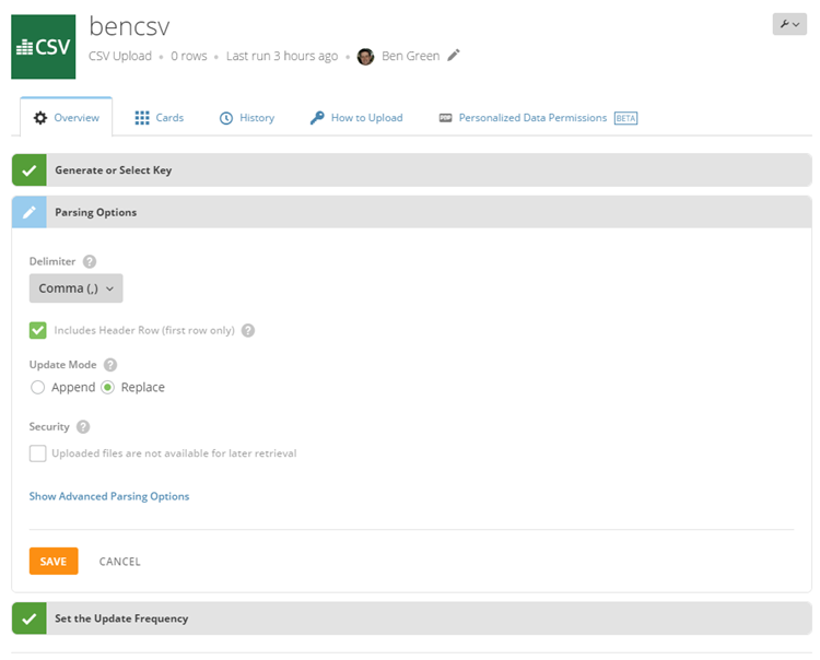 Domo’s new Report Scheduler allows you to get those critical reports into the right hands faster and easier than ever. With just a few clicks of the mouse, you can enable the delivery of any card or page by email at just the right time. You can use this feature to send reports to any Domo user in your instance or any non-Domo user with an authorized domain. Report recipients will see the card details for every card included in the report. Cards in the email are ordered the same way as in Domo, including collections. Recipients with a Domo account can quickly link back to the live card or page in Domo from their desktop or mobile device. You can also manage your reports. In the Report Scheduler page you can see all reports you’ve created and those you receive. You can subscribe and unsubscribe to any of your reports, as well as edit each report’s schedule, view the report histories, send reports immediately, delete reports, and enable or disable individual reports. You can also make Analyzer changes to a report for a page or card that affect only the report; visitors to the actual page or card will not see the filters you have applied. If you have an “Admin” security profile, you can manage all reports for your company. Y ou can edit individual report schedules as well as delete or enable and disable any report. You can also see a full history, including the ability to isolate successful or unsuccessful messages. Finally, if for any reason you need to suspend all Report Scheduler activity, you can disable this feature entirely. Disabling Report Scheduler does not delete or destroy any of the reports that have been scheduled; it simply suspends the sending of reports until the feature is re-enabled. For more information, see Scheduling Reports.CSV Upload