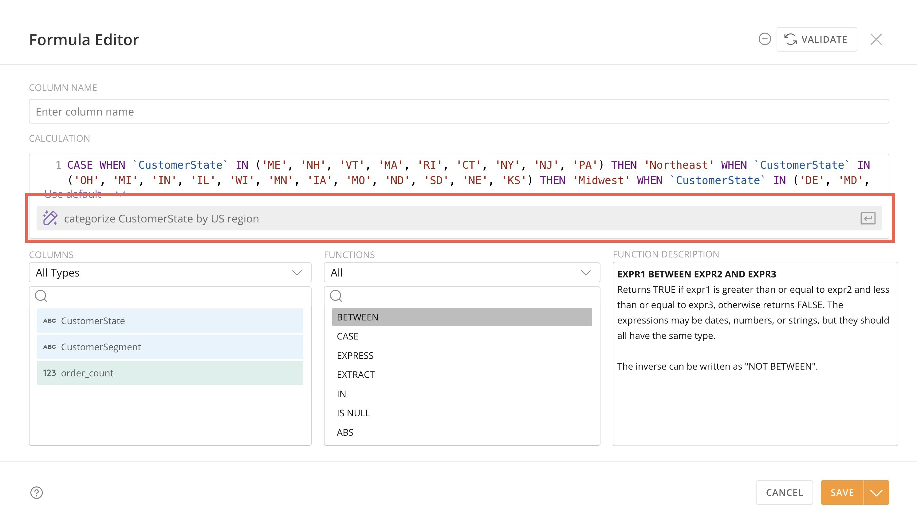At the bottom of the Calculation field in the formula editor, use the prompt field to enter your prompt in natural language and describe the calculation you want to create.
