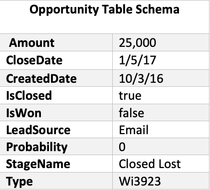 The Marketing ROI App displays revenue, spend, and conversion rates for each lead source at every stage of the funnel, in order to gain a clear view of the real-time ROI for each of your marketing channels—this means that you’ll need two separate tables for running this app. One table will contain “current details about opportunities” and the other table will contain “history of the stages for opportunities”. Certain columns are required in order for the DataFlow to run, the table schemas below display all of the required columns. The column names will be mapped when you fill out the Grid Builder, so you don’t need to change your column names to fit the schemas. Although, you may add other categorical columns to the opportunity table that you’d like to use as filtering options (see examples below.)