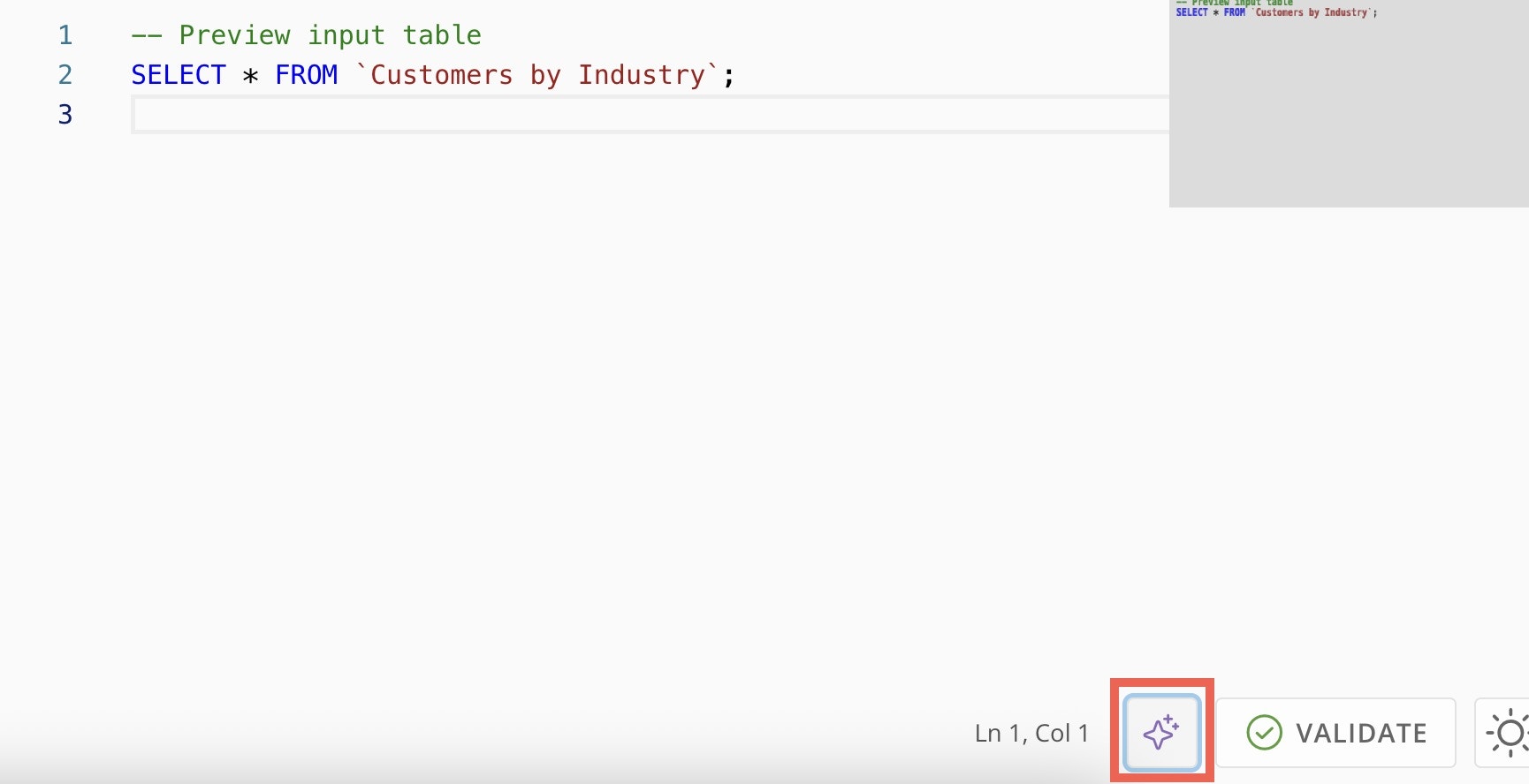AI Assistant to open the prompt field.Enter your query in natural language, using column names from your input data to get a better response. You will receive a warning that the SQL generated by the assistant will replace all current SQL in the pane.