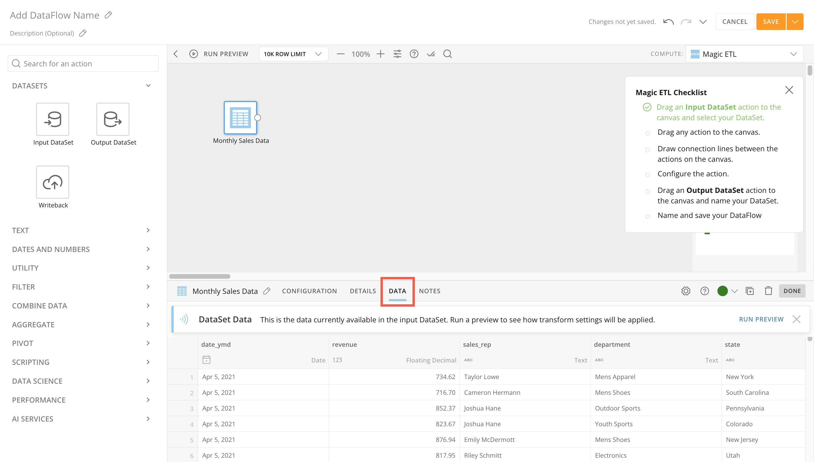 There are three tiles available in the DataSets tab of the Magic ETL interface:- Input DataSet
