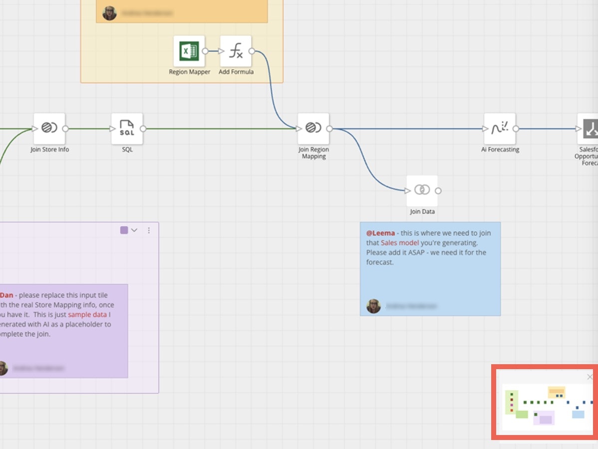 The mini map displays in the corner of the screen and helps you see the layout and navigate around complex and detailed DataFlows. Click and drag the white square in the mini map to move to a certain view of the DataFlow on the canvas.